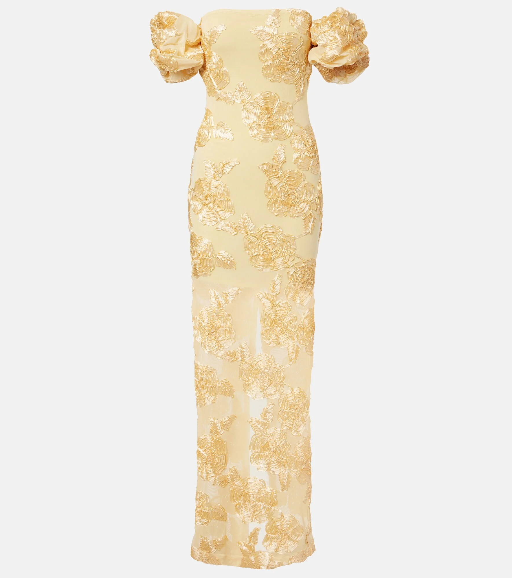 Floral-appliqué off-shoulder maxi dress