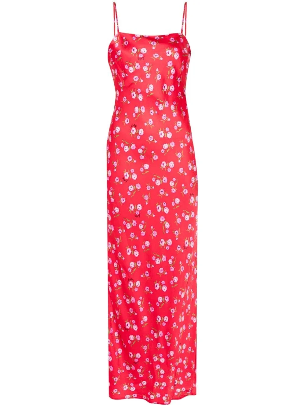 floral-print dress Highlights - Crimson - Satin weave - All-over floral print - Dart detailing - Adjustable spaghetti straps - Sleeveless - Square neck - Long length - Unlined - Straight hem - Concealed side zip fastening Imported Composition Viscose 100% SIZE & FIT Model measurements Height 5 ft 11 in(1.8 m) Bust/Chest 32.67 in(83 cm) Hips 36.22 in(92 cm) Waist 24.4 in(62 cm) FittingInformation Designed for a slim fit that sits just away from the body offering a close yet comfortable fit The adjustable shoulder straps allow for a preferred fit when worn Made from a midweight non-stretch fabric This piece fits true to size – take your usual size