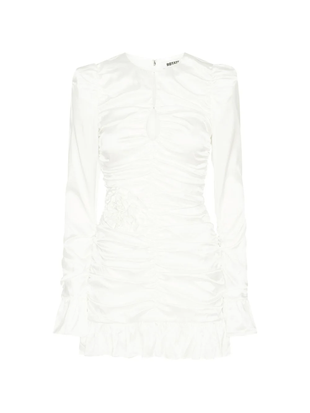 flower ruffled mini dress Highlights - White - Ruffled hem - Flower detail - Long sleeves - Keyhole detail - Ruched Imported Composition Outer: Viscose 96%, Elastane 4% Lining: Polyester 95%, Elastane 5% Washing instructions Read Manufacturer Guidelines