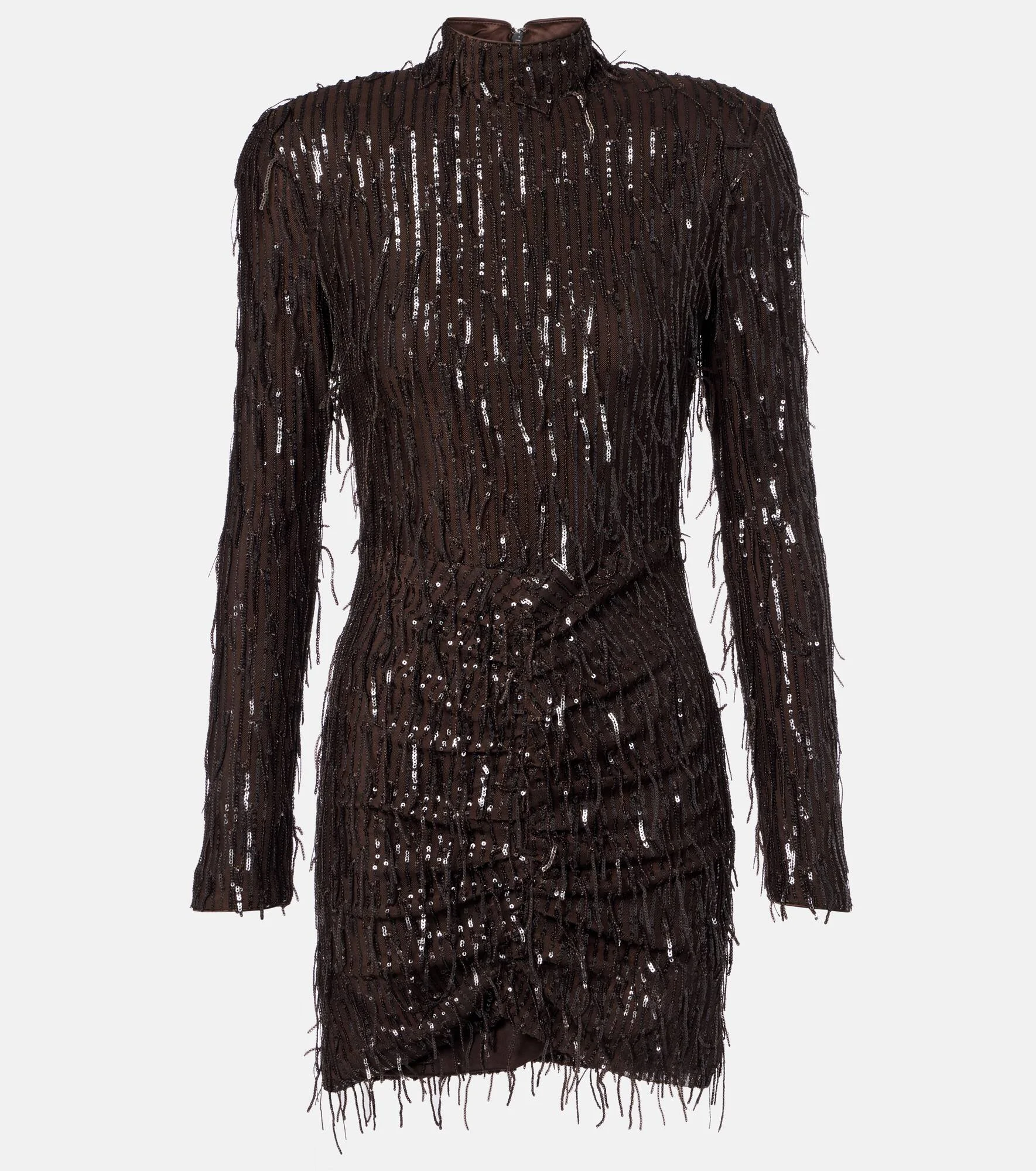 Fill the gaps in your going-out wardrobe with unique and glamorous styles from Rotate. Crafted from mesh, this ruched minidress stands out for its striking fringe detailing and statement sequin embellishments. Product Details - Material: 100% polyester (recycled) - Care instructions: dry clean - Made in China - Designer color name: Chocolate Brown - Item color: brown - Material II: 100% polyester (recycled) - Lining: 88% polyester, 12% elastane - Collar: mockneck - Closure: invisible zipper - Detachable shoulder pads - Item number: P01113112 Size & Fit - True to size - Shoulder pad inserts - Fitted - Slightly stretchy fabric - The model seen in the picture is 178cm-5'10" and wearing a size DE 36