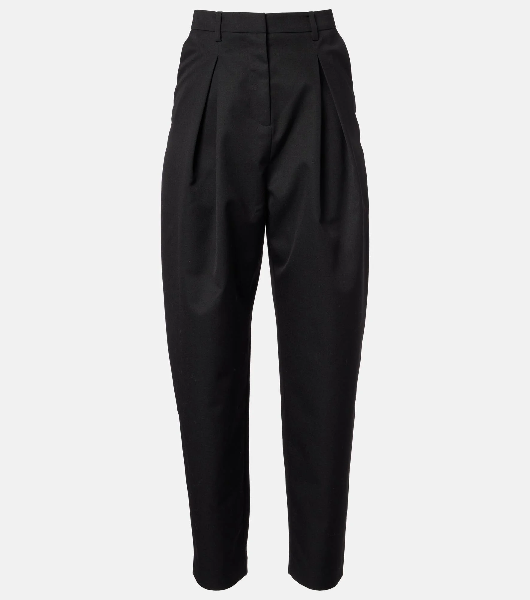 Elegance and ease blend seamlessly in these pants from Rotate. Tailored from a suiting fabric that's blended with wool, they have a high-rise waist and deep pleats along the tapered legs. Product Details - Material: 55% polyester, 45% wool - Care instructions: dry clean - Made in China - Designer color name: Black - Item color: black - Lining: 52% polyester, 48% viscose - Closure: zipper fly, button and hook fastenings - Belt loops - Pockets: side slit pockets - Single pleat - Item number: P01113777 Size & Fit - True to size - Non-stretchy fabric - Tapered leg - High-waisted - The model seen in the picture is 178cm-5'10" and wearing a size DE 34