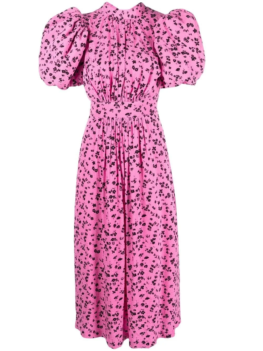 jacquard puff-sleeve midi dress ROTATE BIRGER CHRISTENSEN was created in response to the creative directors' conversations about the shortcomings of their own wardrobes. Crafted from a FSC viscose blend, this midi dress is animated by an all-over jacquard pattern and cut-out detailing at the rear. Highlights - Pink - Fsc viscose blend - Patterned jacquard - High neck - Short puff sleeves - Open back - Calf-length Imported Composition Lining: Polyester 97%, Elastane 3% Outer: FSC Viscose 51%, Viscose 49% SIZE & FIT Model measurements Height 5 ft 10 in(1.78 m) Bust/Chest 31.49 in(80 cm) Hips 35.03 in(89 cm) Waist 23.62 in(60 cm) Measurement HIPS 38.58 in(98 cm) LENGTH 46.85 in(119 cm) WAIST 23.62 in(60 cm) Washing instructions Dry Clean Only