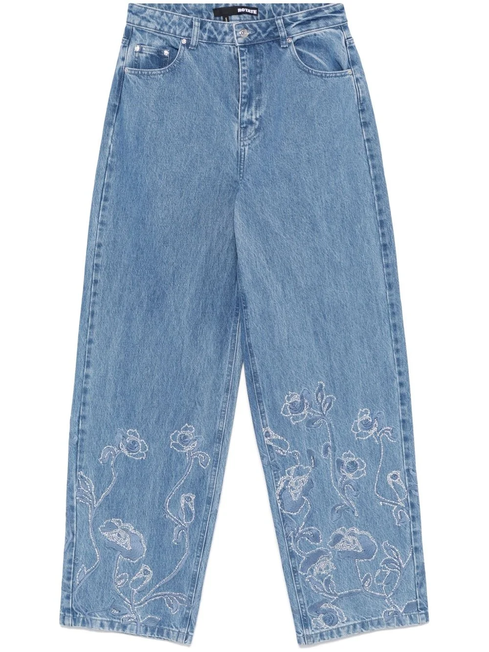 rhinestoned wide-leg jeans Highlights - Indigo blue - Organic cotton - Washed denim - Rhinestone detailing - Wide leg - Front button and zip fastening - Mid-rise - Belt loops - Classic five pockets - Floral motif - Logo patch to the rear Imported Composition Organic Cotton 100% SIZE & FIT Model measurements Height 5 ft 11 in(1.8 m) Bust/Chest 33.07 in(84 cm) Hips 37.4 in(95 cm) Waist 25.19 in(64 cm) Measurement FRONT RISE 12.4 in(31.5 cm) HIPS 39.37 in(100 cm) WAIST 27.55 in(70 cm) FittingInformation Designed with a wide leg cut, these jeans allow for a close fit at the waist and offer a loose and roomy fit over the leg Sturdy and hard-wearing, this denim piece offers no stretch Washing instructions Machine Wash