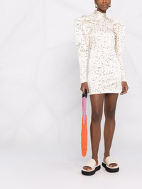 Kim puff-sleeve dress ROTATE BIRGER CHRISTENSEN's Kim dress displays a bold '80s-inspired aesthetic. Featuring a high neck and long puffed sleeves, the design is accented with ruched detailing and a unique print. Highlights - Cream white kim puff-sleeve dress from rotate featuring motif print, high neck, long puff sleeves and rear button and zip fastening. Imported Composition Viscose 96%, Spandex/Elastane 4% SIZE & FIT Model measurements Height 5 ft 10 in(1.78 m) Bust/Chest 31.49 in(80 cm) Hips 37 in(94 cm) Waist 23.62 in(60 cm) FittingInformation This piece fits true to size. We recommend you get your regular size Designed for a close fit at the bust, waist and hips Made with a mid-weight stretch fabric Washing instructions Dry Clean Only