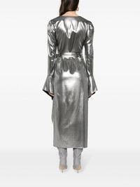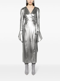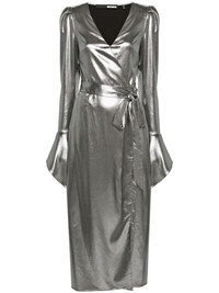 lame wrap midi dress Highlights - Silver-tone - Recycled polyester - Lame effect - Wrap design - Plunging v-neck - Long puff sleeves - Flared cuffs - Side slit - Internal logo tag - Full lining - Mid-length - Straight hem - Press-stud fastening - Self-tie fastening Imported Composition Outer: Recycled Polyester 100% Lining: Polyester 100% SIZE & FIT Model measurements Height 5 ft 11 in(1.8 m) Bust/Chest 31.49 in(80 cm) Hips 36.22 in(92 cm) Waist 25.59 in(65 cm) FittingInformation Designed for a wraparound style that can be adjusted to your preference The internal shoulder pads offer a structured shape Made from a midweight non-stretch fabric, this piece offers minimal elasticity when worn This piece fits true to size – take your usual size Washing instructions Hand Wash