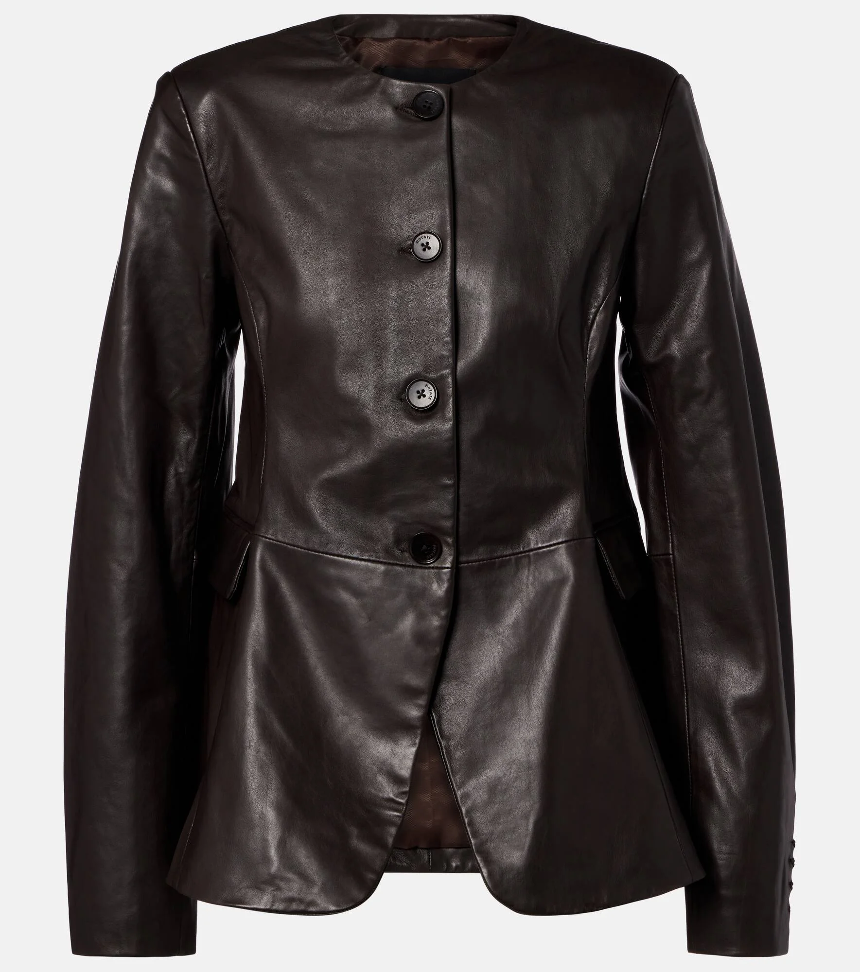 Fill the gaps in your going-out wardrobe with unique and glamorous styles from Rotate. This jacket is constructed from supple leather with a fit-and-flare silhouette and buttoned front closure. Product Details - Material: 100% lamb leather - Care instructions: specialist clean - Made in India - Color: brown - Designer color name: Mole - Lining: 100% polyester (recycled) - Closure: buttoned front - Pockets: flap pockets - Item number: P01133438 Size & Fit - True to size - Shoulder pad inserts - Straight fit - Falls below the hip - The model seen in the picture is 178cm-5'10" and wearing a size DE 34