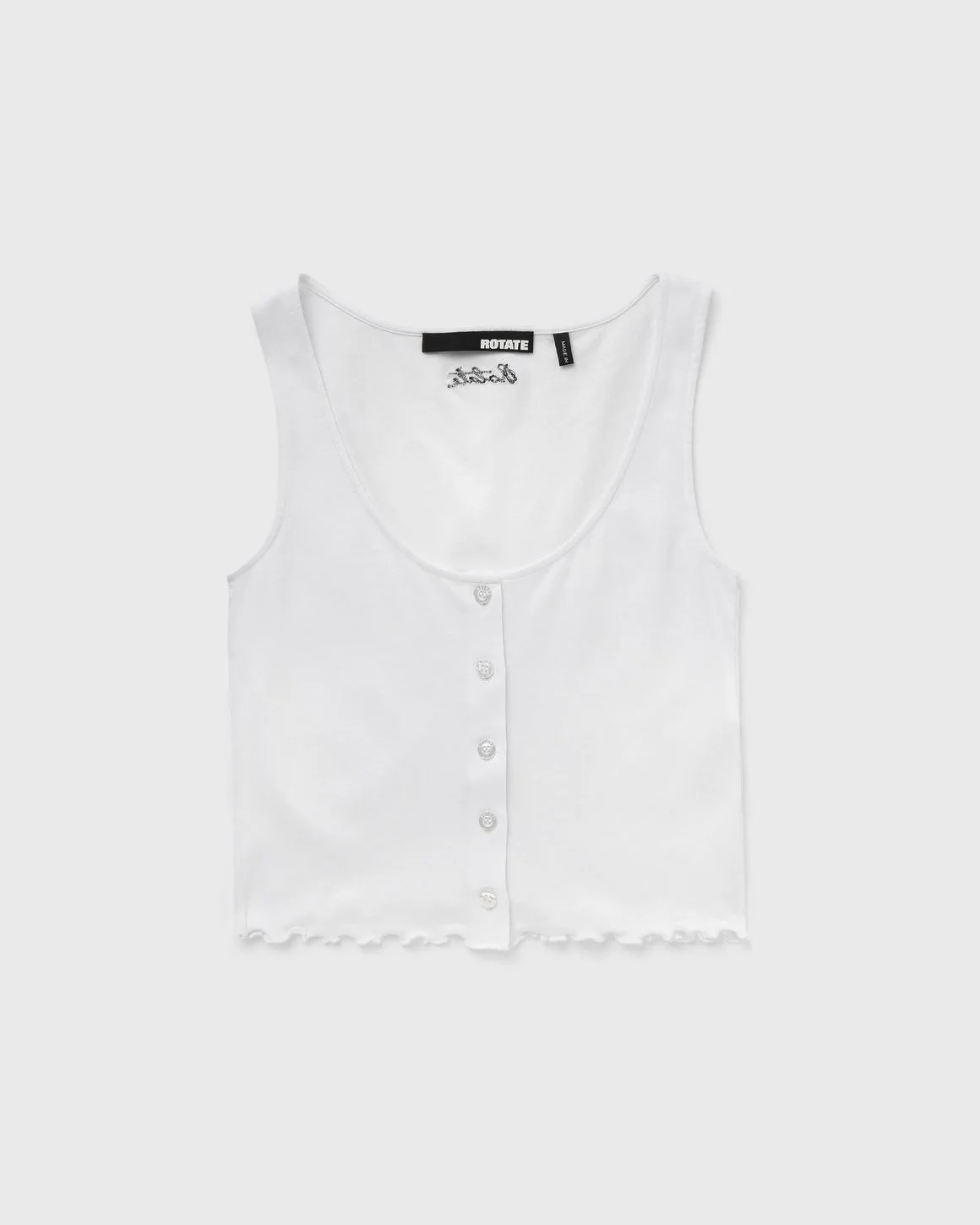 The Buttoned Tank Top by ROTATE Birger Christensen is a fitted design with buttons on the front and a delicate mini ruffle trim at the bottom. The back is decorated with an embroidered logo that adds a subtle accent. - Buttons on the front - Ruffle trim - Embroidered logo This item is partly made of certified, recycled and sustainable materials, reducing the global amount of waste and conserving primary raw materials. Discover a wide range of sustainable items now at BSTN! Article Number: 113787400 Gender: Women Color: BRIGHT WHITE Material: 100% Cotton