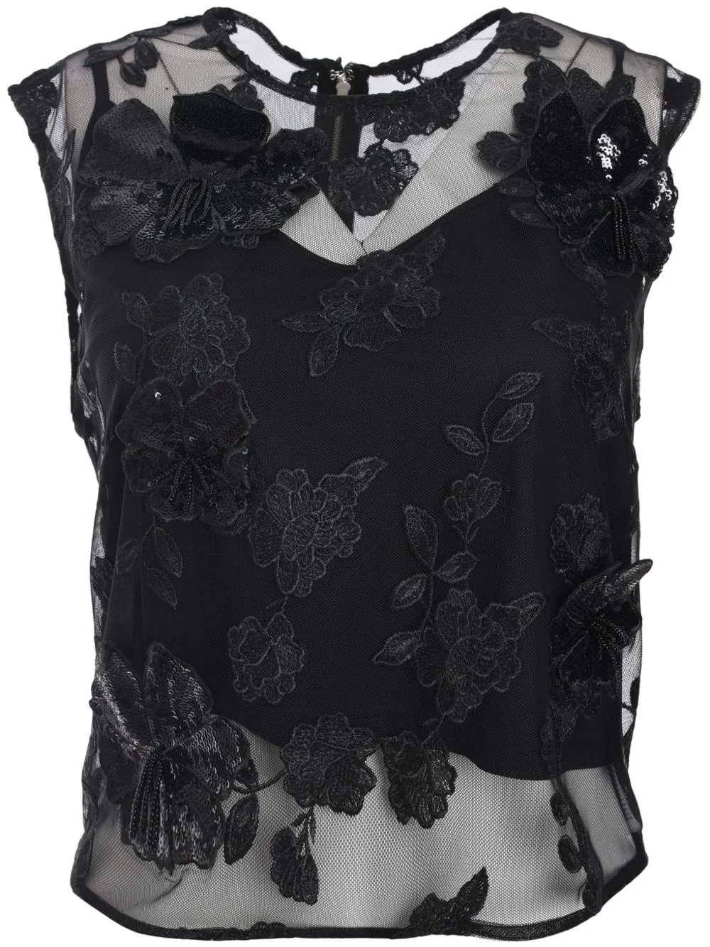 mesh flower top Highlights - Black - Rear zip fastening - V-neck - Floral-lace detailing - Sleeveless Imported Composition Certified Cotton 100%, Mesh 100%