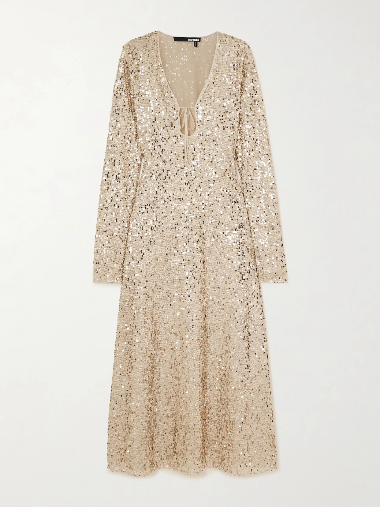 Illuminate any event with ROTATE Birger Christensen's midi dress. Made from recycled-tulle, it's covered in scores of light-catching gold sequins and has a plunging keyhole neckline that secures with slim ties. Style yours with a lariat chain.