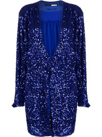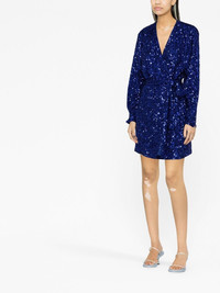 sequin-embellished V-neck wrap dress A nod to the '80s disco days, ROTATE BIRGER CHRISTENSEN presents this mini wrap dress in a 'Blue Iris' hue. Embellished with sparkling sequins all over, it is secured with a tie band and concealed snap buttons on the waist. Highlights - Sequin-embellished v-neck wrap dress from rotate featuring midnight blue, stretch-design, sequin embellishment, wrap design, v-neck, long sleeves, self-tie fastening, snap-fit fastening, thigh-length and straight hem. . Imported Composition Lining: Polyamide 95%, Spandex/Elastane 5% Outer: Recycled Polyester 95%, Spandex/Elastane 5% SIZE & FIT Model measurements Height 5 ft 10 in(1.77 m) Bust/Chest 32.67 in(83 cm) Hips 35.43 in(90 cm) Waist 23.62 in(60 cm) Measurement HIPS 35.43 in(90 cm) LENGTH 32.28 in(82 cm) WAIST 27.55 in(70 cm) FittingInformation This piece fits true to size. We recommend you get your regular size Designed for a close fit at the bust, waist and hips Made with a mid-weight stretch fabric Washing instructions Dry Clean Only