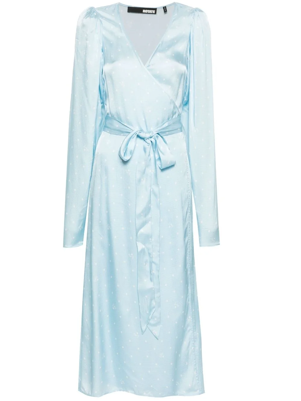 polka-dot wrap dress Highlights - Light blue/white - Patterned jacquard - Polka dot print - Logo print embellishment - Wrap design - Gathered detailing - Internal ruffle inserts at the shoulder - V-neck - Balloon sleeves - Self-tie fastening - Mid-length - Flared hem - Unlined Imported Composition Viscose 100% SIZE & FIT Model measurements Height 5 ft 10 in(1.78 m) Bust/Chest 33.07 in(84 cm) Hips 36.61 in(93 cm) Waist 24.8 in(63 cm) FittingInformation Designed for a wraparound style that can be adjusted to your preference The adjustable tie waist gives a more adaptable and personalised fit Made from a lightweight non-stretch fabric This piece fits true to size – take your usual size