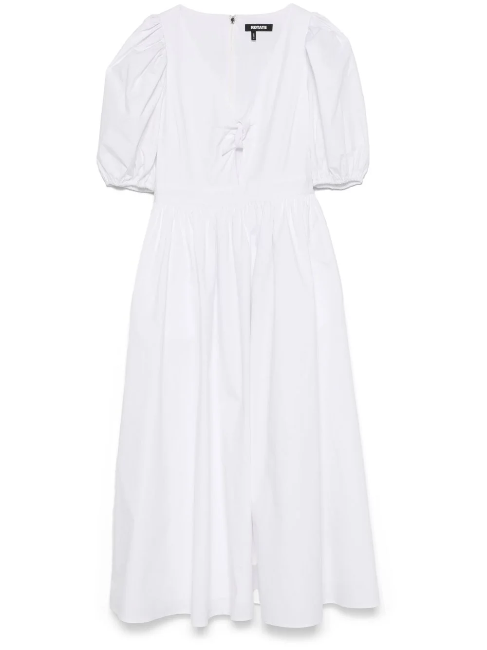 puff-sleeve midi dress Highlights - White - Concealed rear hook and zip fastening - Front tie fastening - Elasticated cuffs - Two side inset pockets Imported Composition Outer: Organic Cotton 97%, Elastane 3% Lining: Polyester 90%, Elastane 10% SIZE & FIT Model measurements Height 5 ft 10 in(1.78 m) Bust/Chest 33.46 in(85 cm) Hips 36.22 in(92 cm) Waist 23.22 in(59 cm) FittingInformation Designed for a close fit at the chest and waist with a loose fit at the hip Made from a midweight stretch fabric, this piece offers elasticity and flexibility when worn