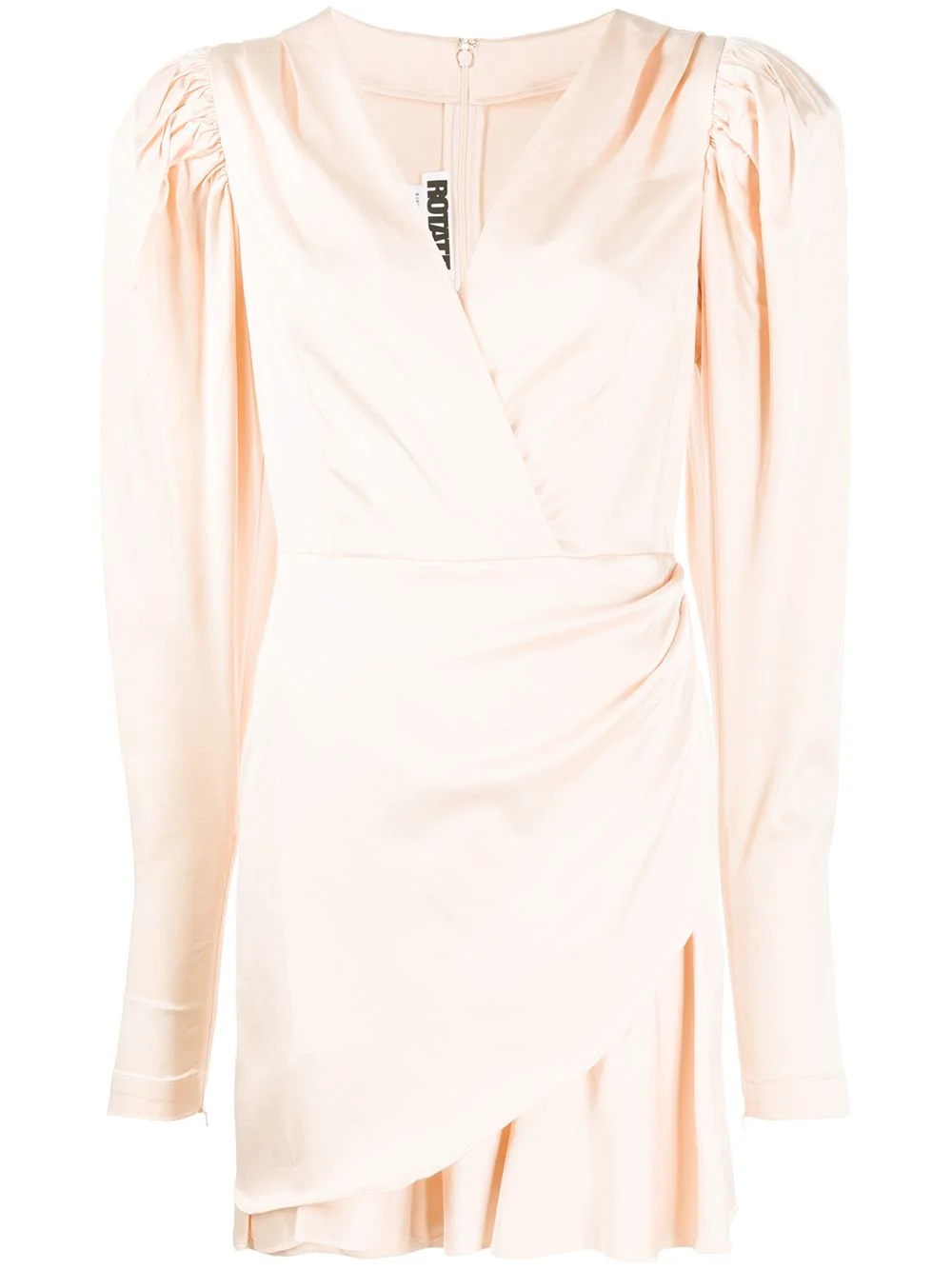 puff sleeved dress Pastel rose puff sleeved dress from ROTATE featuring a wrap waist, a v-neck, long sleeves and a short length. Imported Composition Viscose 100% SIZE & FIT Model measurements Height 5 ft 10 in(1.78 m) Bust/Chest 33.07 in(84 cm) Hips 36.61 in(93 cm) Waist 24.8 in(63 cm) FittingInformation This piece fits true to size. We recommend you get your regular size Designed for a close fit at the bust, waist and hips Made with a mid-weight stretch fabric Washing instructions Machine Wash