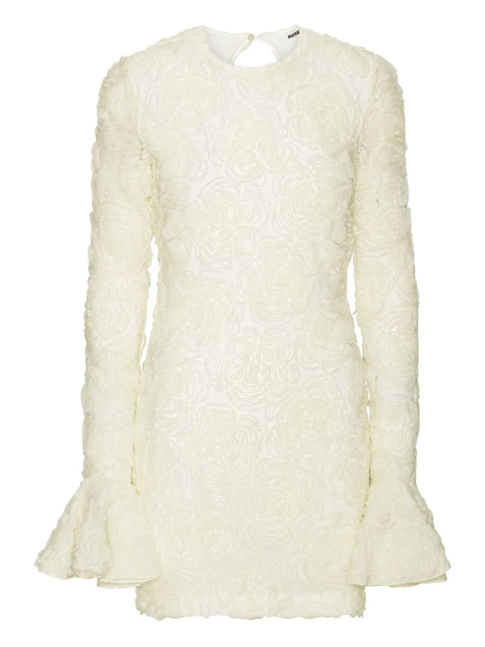 rose-embellished bell-sleeve mini dress Highlights - Off-white - Rose pattern - Long sleeves - Bell sleeves - Round neck - Keyhole back detail Imported Composition Lining: Polyester 88%, Elastane 12% Outer: Recycled Polyester 95%, Elastane 5% Washing instructions Hand Wash