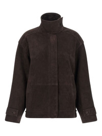 high-neck oversized jacket Highlights - Brown - High neck - Elastic drawstring hem - Pockets - Long sleeves - Strap-on cuffs Imported Composition Outer: Goat Skin 100% Lining: Polyester 54%, Viscose 46%