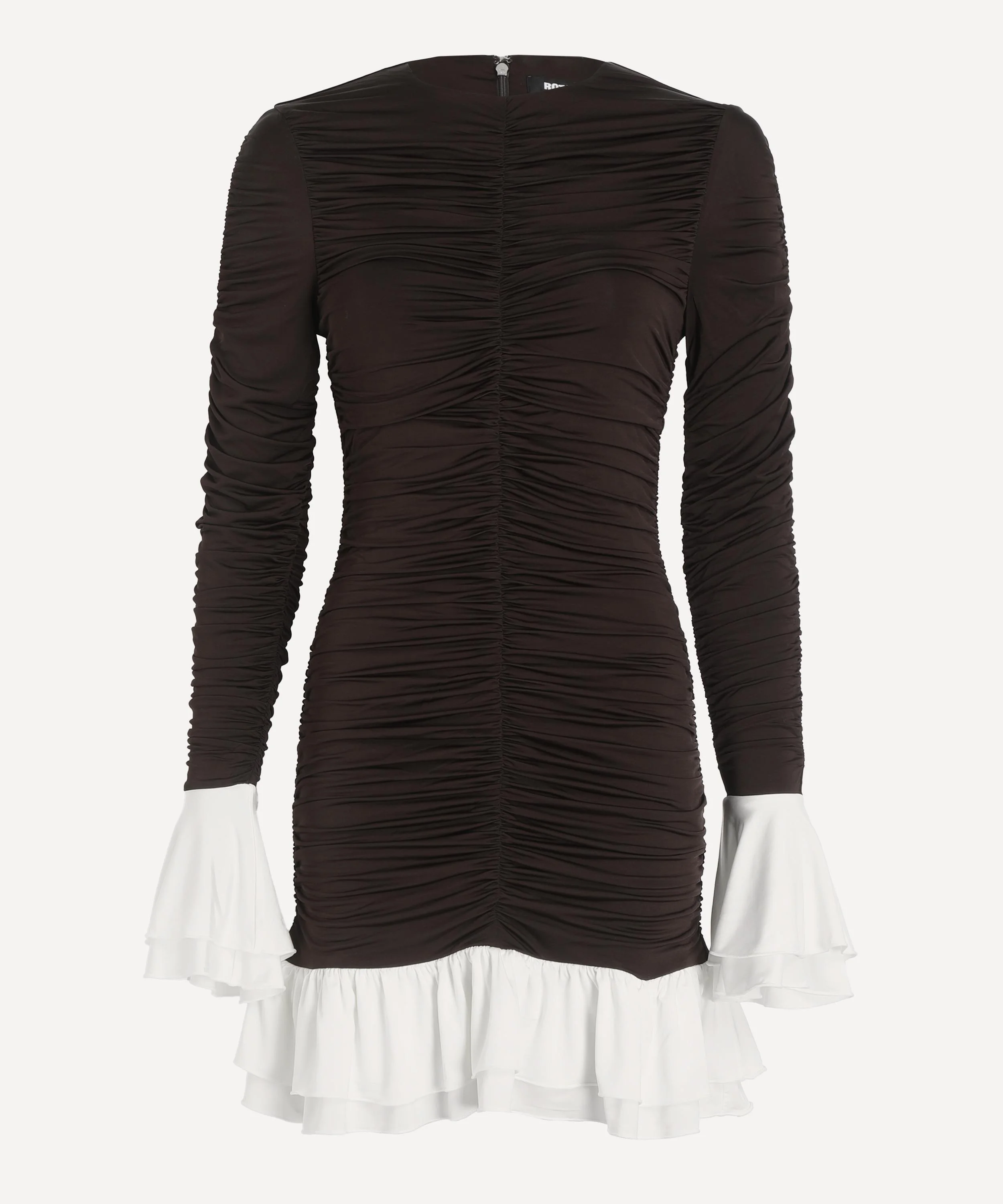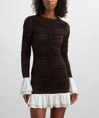 DETAILS Mini dress Slim fit Long sleeves Round neckline All-over ruched detailing Flounce cuffs and hem Tonal back zip closure Lined SIZE & FIT Model is 178cm/5'10"; Chest: 77cm; Waist: 65cm; Hip: 92cm and wears a size 8 COMPOSITION & CARE 95% Polyester; 5% Elastane Lining: 95% Polyester; 5% Elastane Dry clean