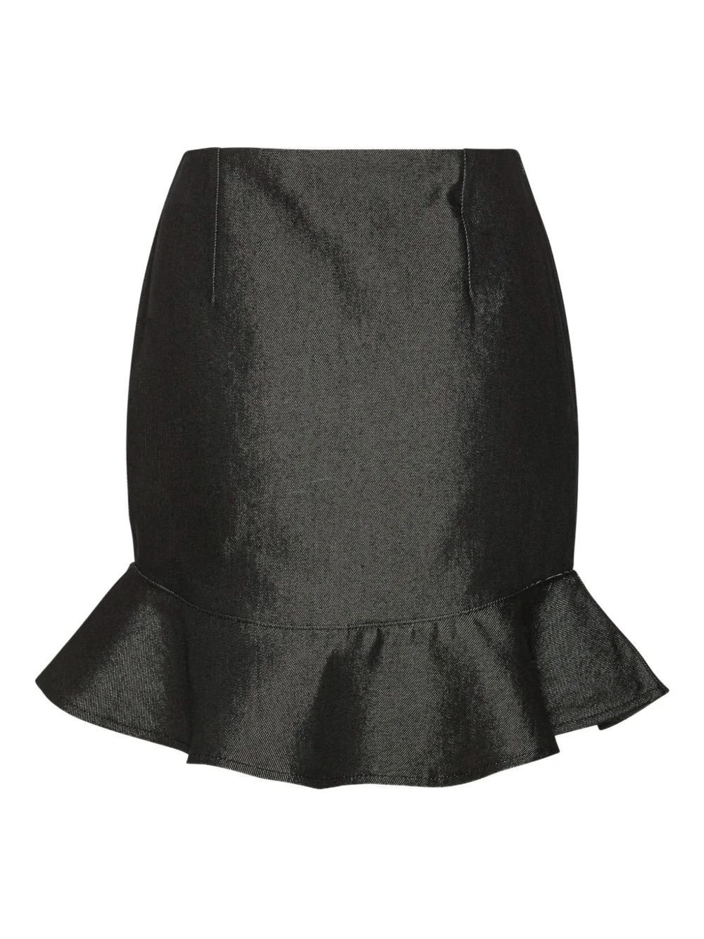 ruffle-denim mini skirt Highlights - Black - Denim effect - Ruffle hem - Mini length - Organic cotton Imported Composition Organic Cotton 65%, Polyester 35% Washing instructions Read Manufacturer Guidelines
