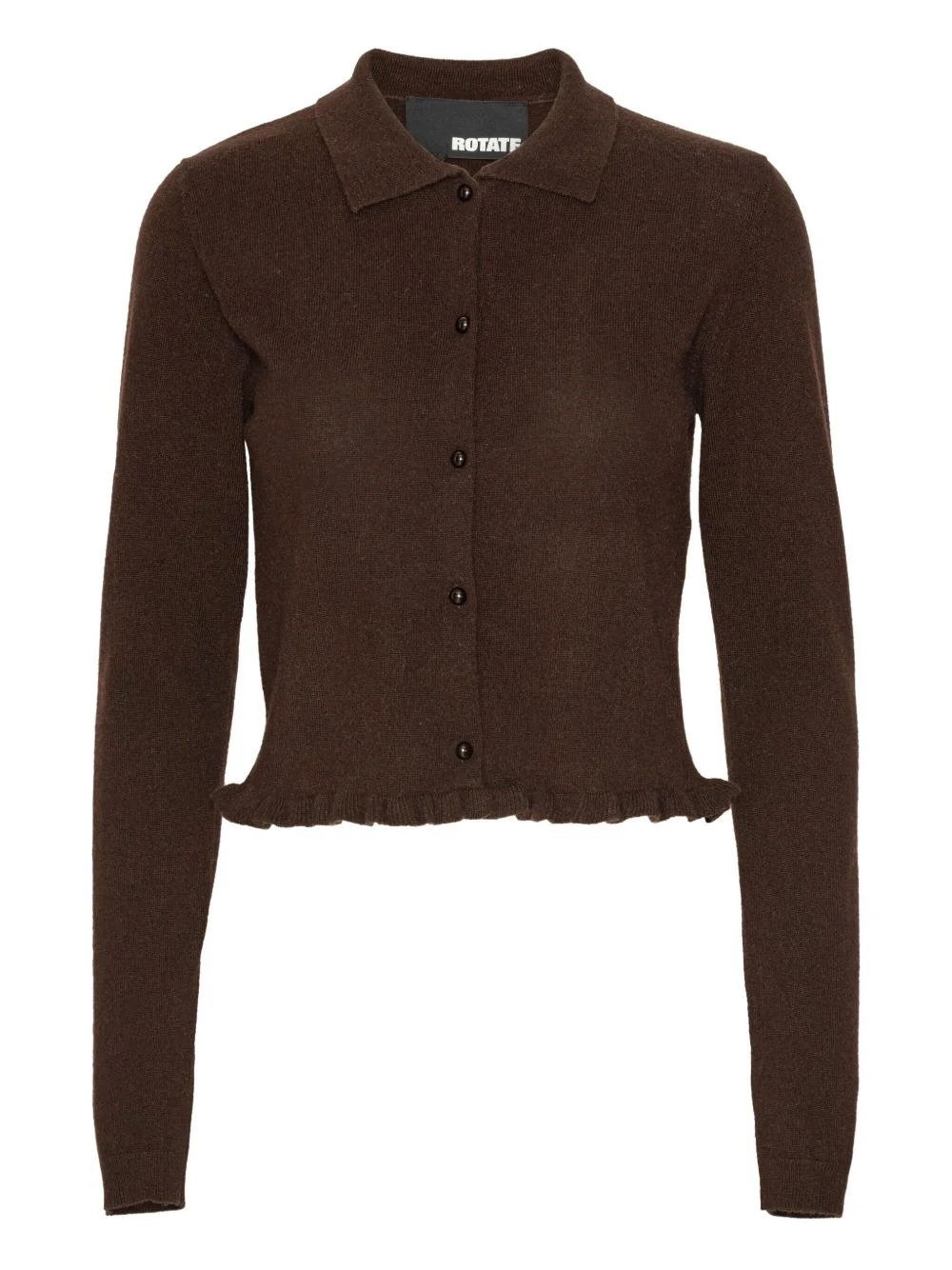 ruffled-hem cardigan Highlights - Brown - Button fastening - Long sleeves - Polo collar - Ruffled hem Imported Composition Wool 95%, Cashmere 5% Washing instructions Read Manufacturer Guidelines