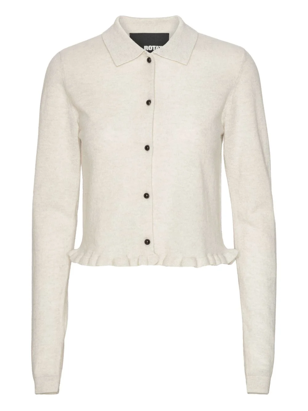 ruffled-hem cardigan Highlights - Light grey - Button fastening - Long sleeves - Polo collar - Ruffled hem Imported Composition Wool 95%, Cashmere 5% Washing instructions Read Manufacturer Guidelines