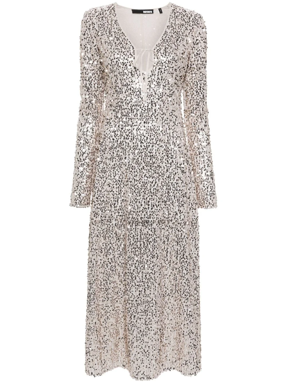 sequin-embellished dress Highlights - Gold-tone - Recycled polyester - Sequin embellishment - V-neck - Long sleeves - Bow detailing - Mesh lining - Side zip fastening Imported Composition Outer: Recycled Polyester 100% Lining: Polyester 92%, Spandex/Elastane 8% SIZE & FIT Model measurements Height 5 ft 10 in(1.78 m) Bust/Chest 33.07 in(84 cm) Hips 36.61 in(93 cm) Waist 24.8 in(63 cm) Measurement SLEEVE LENGTH 26.37 in(67 cm) HIPS 33.46 in(85 cm) LENGTH 53.54 in(136 cm) WAIST 22.83 in(58 cm) FittingInformation Designed for a slim fit that sits just away from the body offering a close yet comfortable fit Made from a midweight stretch fabric, this piece offers elasticity and flexibility when worn This piece fits true to size – take your usual size