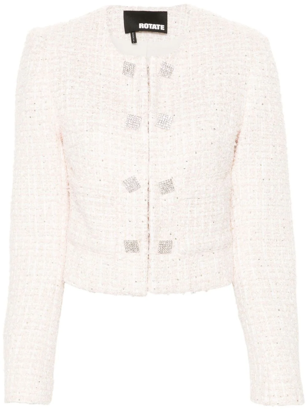 sequin-embellished jacket Highlights - Light pink/white/light beige - Recycled polyester - Tweed - Sequin embellishment - Crew neck - Collarless - Long sleeves - Decorative button detailing - Crystal-embellished buttons - Two front patch pockets - Full lining - Straight hem - Hook fastening Imported Composition Lining: Polyester 100% Outer: Recycled Polyester 100% SIZE & FIT Model measurements Height 5 ft 10 in(1.77 m) Bust/Chest 32.28 in(82 cm) Hips 35.03 in(89 cm) Waist 25.19 in(64 cm) FittingInformation Designed for a slim fit that sits just away from the body offering a close yet comfortable fit The internal shoulder pads offer a structured shape Made from a midweight non-stretch fabric This piece fits true to size – take your usual size