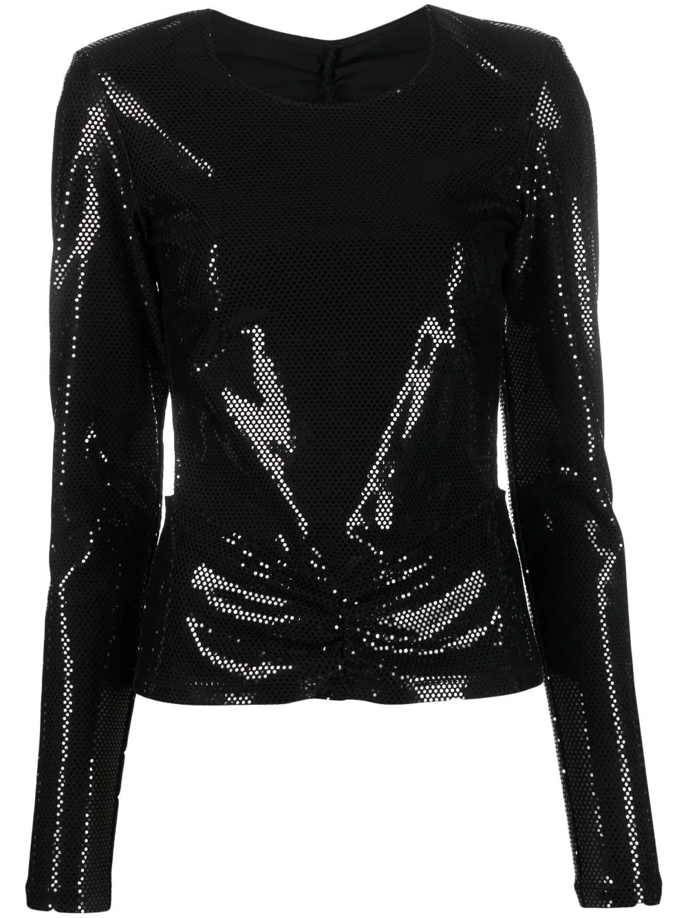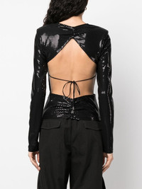 sequin-embellished open-back top ROTATE BIRGER CHRISTENSEN's playful party style and penchant for glamourous details is showcased by this shimmering sequin-embellished 'Ivonka' top, characterised by its distinctive open-back cut-out design. Highlights - Black - Sequin embellishment - Ruched detailing - Round neck - Long sleeves - Open back - Rear tie fastening - Straight hem Imported Composition Viscose 60%, Polyamide 35%, Spandex/Elastane 5% SIZE & FIT Model measurements Height 5 ft 10 in(1.79 m) Bust/Chest 33.07 in(84 cm) Hips 35.82 in(91 cm) Waist 24.01 in(61 cm) FittingInformation Designed for a slim fit that sits just away from the body offering a close yet comfortable fit The internal shoulder pads offer a structured shape Made from a midweight stretch fabric, this piece offers elasticity and flexibility when worn This piece fits true to size – take your usual size
