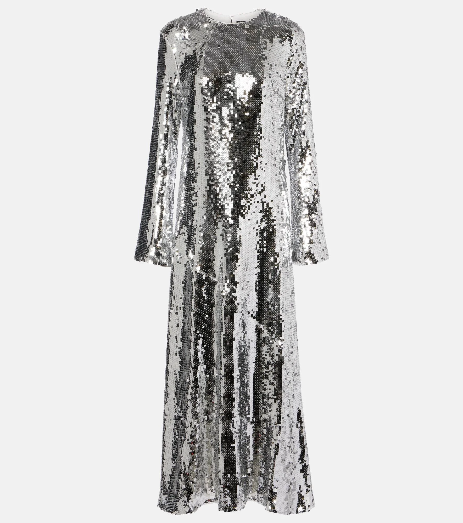 The sequined maxi dress from Rotate features a zipped back and a cinched waist. Designed to stand out, it brings glamorous energy and unique character to your going-out wardrobe. Product Details - Material: 95% polyester (recycled), 5% elastane - Care instructions: dry clean - Made in China - Designer color name: Glacier Gray - Item color: silver - Closure: zipped back - Material II: 100% polyester (recycled) - Lining: 88% polyester, 12% elastane - Item number: P01086864 Size & Fit - True to size - Cinched waist - Stretchy fabric - The model seen in the picture is 178cm-5'10" and wearing a size DE 34