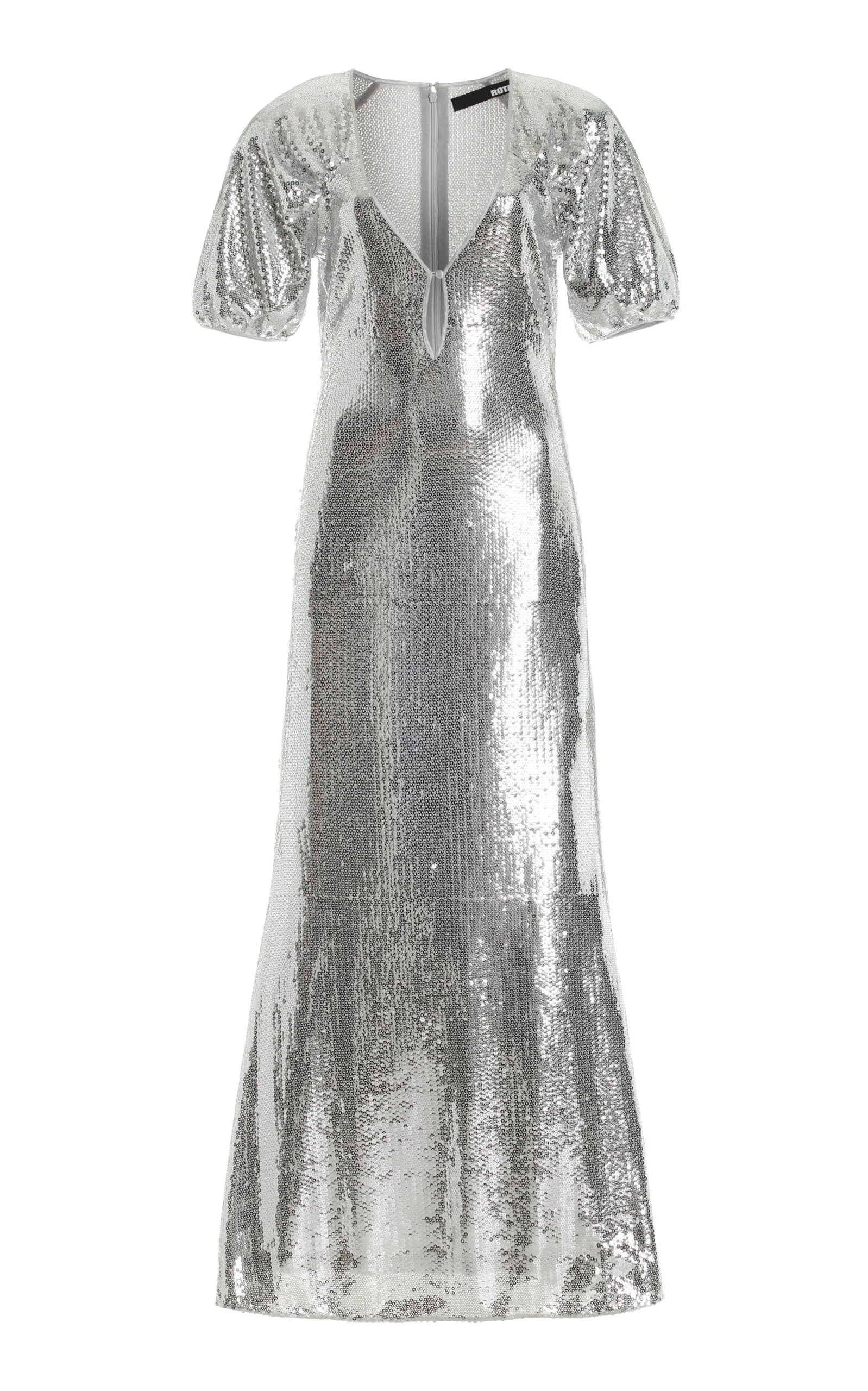 Throw on a party piece by Danish It girls Thora Valdimars and Jeanette Madsen, and you’re guaranteed to feel your oats—such is the power of their cool-girl glamour. Adorned generously in silver sequins, this dress features a midi fishtail shape complete with short puffed sleeves and a V-neck. PRODUCT DETAILS - Resort '25 - Concealed zip fastening along back - Composition: 100% Recycled Polyester; Lining: 92% Polyester, 8% Elastane - Dry clean only - Imported SIZE & FIT - Our model is wearing a size EU 32 - Model is 5'10" with a 31.5" bust, 23.5" waist, and 35" hip - Designed for a slim fit