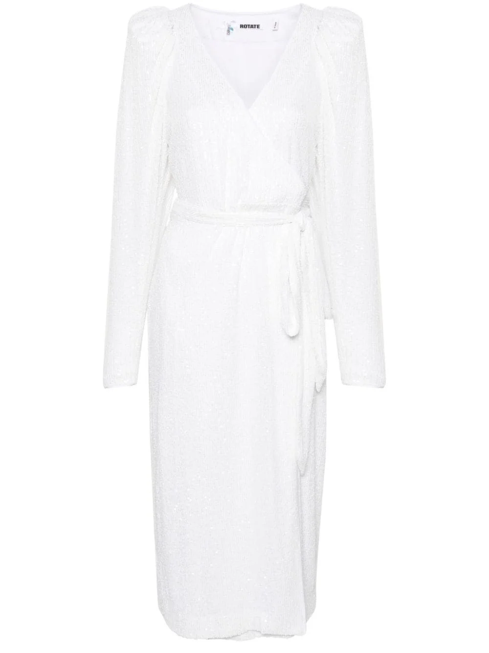 sequined midi wrap dress Highlights - White - Recycled polyester blend - Stretch-design - Sequin design - Wraparound style - V-neck - Shoulder pads - Long puff sleeves - Below-knee length - Full lining - Straight hem - Side tie fastening Imported Composition Outer: Recycled Polyester 95%, Spandex/Elastane 5% Lining: Polyester 97%, Spandex/Elastane 3% SIZE & FIT Model measurements Height 5 ft 10 in(1.77 m) Bust/Chest 33.07 in(84 cm) Hips 37 in(94 cm) Waist 24.8 in(63 cm) FittingInformation Designed for a wraparound style that can be adjusted to your preference The internal shoulder pads offer a structured shape Made from a midweight stretch fabric, this piece offers elasticity and flexibility when worn This piece fits true to size – take your usual size Washing instructions Dry Clean Only