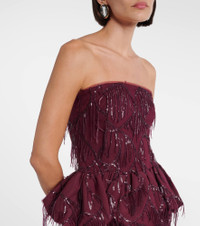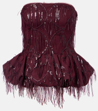 Fill the gaps in your going-out wardrobe with unique and glamorous styles from Rotate. This top is a shimmering choice with its tonal sequined fringes and features a peplum silhouette. Product Details - Material: 100% polyester - Care instructions: hand wash cold - Made in China - Designer color name: Port Royale - Item color: burgundy - Lining: 97% viscose, 3% elastane - Trim: 100% polyester - Closure: zipped side - Fringed hem - Item number: P01113107 Size & Fit - True to size - Strapless - Cinched waist - Non-stretchy fabric - Falls to the hip - The model seen in the picture is 178cm-5'10" and wearing a size DE 34