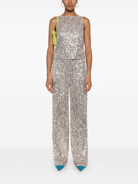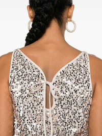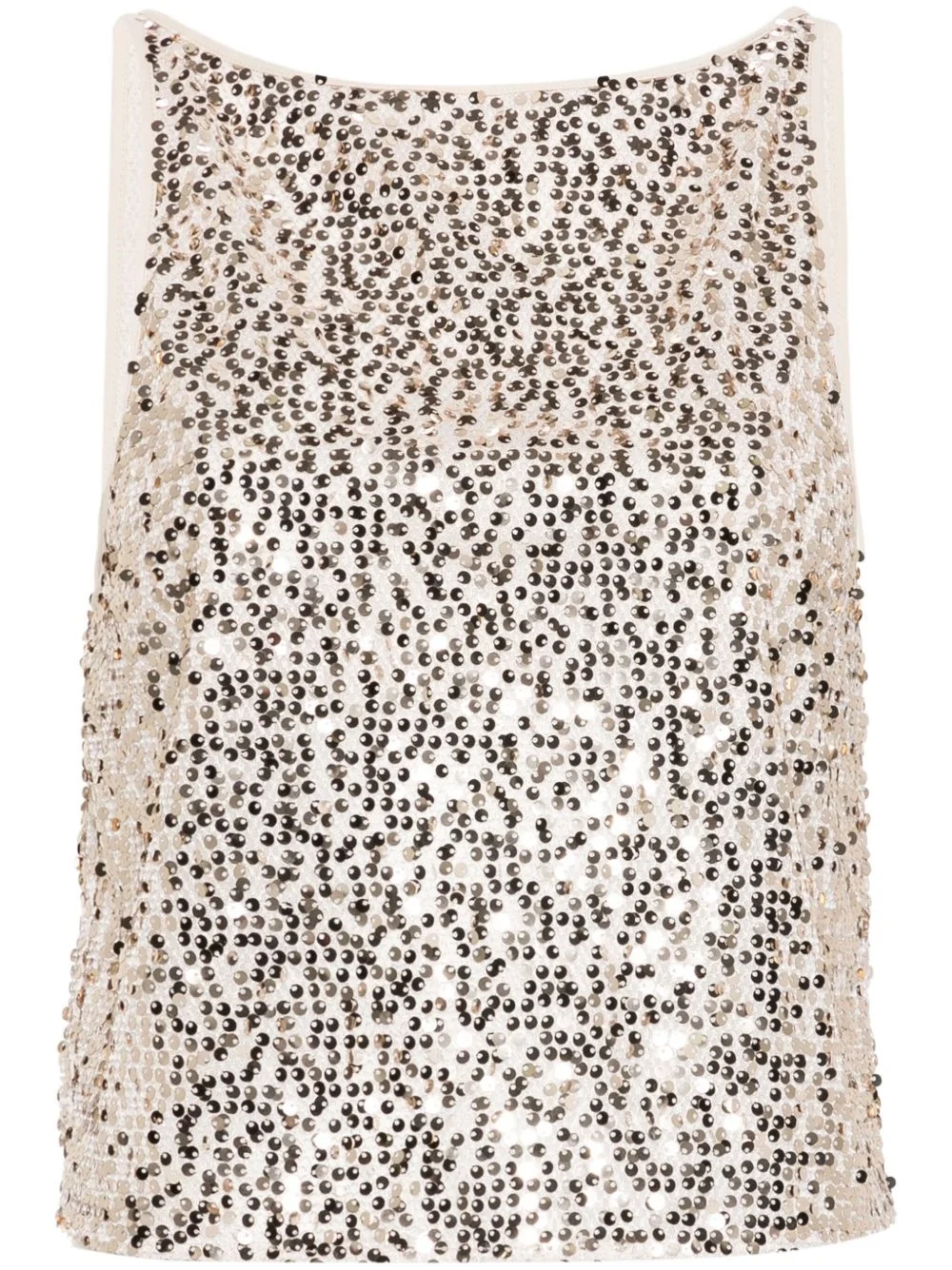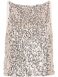sequinned mesh tank top Highlights - Light beige - Gold-tone - Mesh design - Sequin design - Keyhole detail to the rear - Boat neck - Sleeveless - Rear tie fastening - Cropped - Straight hem - Mesh lining Imported Composition Lining: Polyester 92%, Spandex/Elastane 8% Outer: Recycled Polyester 100% SIZE & FIT Model measurements Height 5 ft 10 in(1.78 m) Bust/Chest 33.07 in(84 cm) Hips 36.61 in(93 cm) Waist 24.8 in(63 cm) FittingInformation Designed for a relaxed fit, this piece allows for comfort and movement when worn The tie fastening gives an adaptable and personalised fit Made from a midweight stretch fabric, this piece offers elasticity and flexibility when worn This piece fits true to size – take your usual size