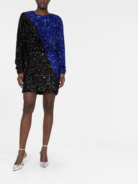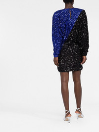 two-tone sequin minidress Copenhagen-based ROTATE BIRGER CHRISTENSEN exhibits high-octane style with this minidress for SS23. Presented in iris blue and black as a slashed, diagonal colour-block, the garment features a tailored waist and shoulder pads to complete the retro-inspired aesthetic. Highlights - Iris blue/black - Stretch-recycled polyester - Two-tone design - Sequin embellishment - Round neck - Fitted waistline - Keyhole detail to the rear - Concealed side zip fastening - Long sleeves - Straight hem Imported Composition Lining: Polyamide 95%, Spandex/Elastane 5% Outer: Recycled Polyester 95%, Spandex/Elastane 5% SIZE & FIT Model measurements Height 5 ft 10 in(1.77 m) Bust/Chest 32.28 in(82 cm) Hips 35.03 in(89 cm) Waist 25.19 in(64 cm) FittingInformation This piece fits true to size. We recommend you get your regular size Designed for a loose fit at the bust and waist with a close fit on the hips Made with a mid-weight stretch fabric
