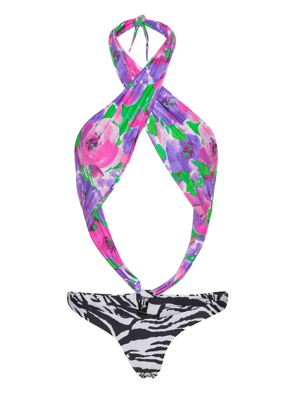 x Reina Olga Showpony swimsuit Highlights - Purple/multicolour - Floral print - Zebra print - Halterneck tie fastening - Backless - Cut-out design - Be mindful to try on swimwear over your own garments. Imported Composition Nylon 78%, Spandex/Elastane 22% Washing instructions Read Manufacturer Guidelines