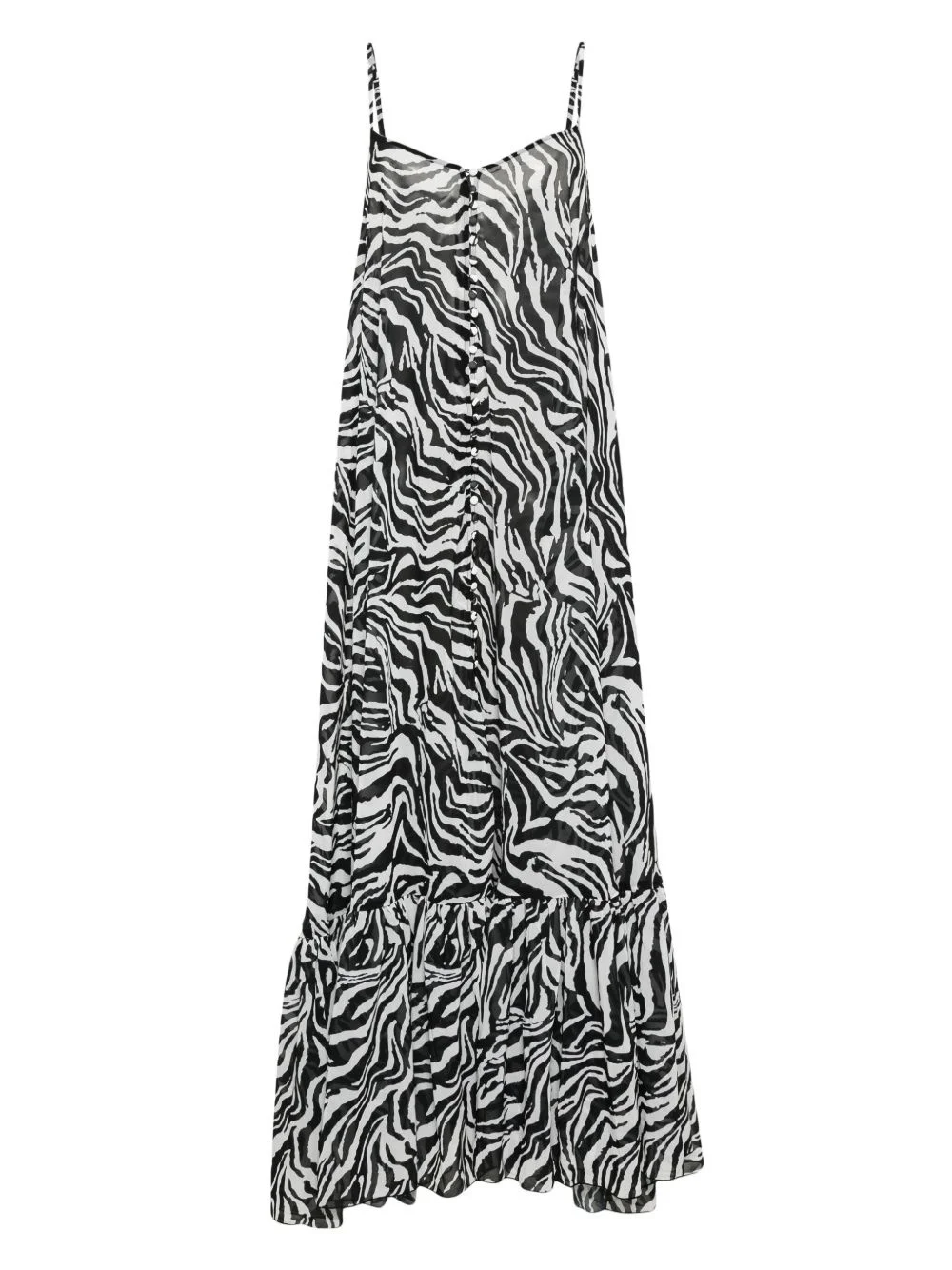 x Reina Olga zebra-print maxi dress Highlights - Black/white - Recycled polyester - Crepe texture - Semi-sheer construction - Zebra print - Adjustable spaghetti straps - Sleeveless - V-neck - Two side inset pockets - Full-length - Ruffle hem - Unlined - Front button fastening Imported Composition Recycled Polyester 100%