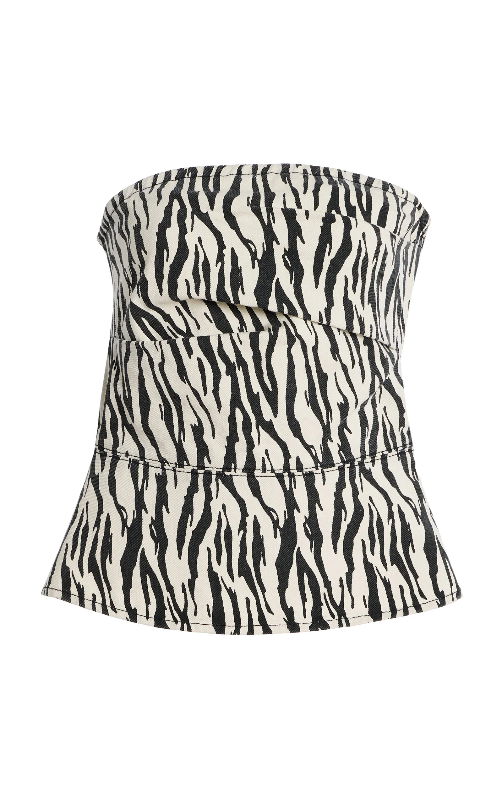 Throw on a party piece by Danish It girls Thora Valdimars and Jeanette Madsen, and you’re guaranteed to feel your oats—such is the power of their cool-girl glamour. This strapless top has a ruched design made from organic cotton denim with a zebra print. Pair with the matching pant. PRODUCT DETAILS - Pre-Fall '25 - Slip on - Composition: 100% organic cotton - Designer color: Egret - Dry clean - Imported SIZE & FIT - Our model is wearing a size EU 34 - Model is 5'11" with a 30" bust, 24" waist, and 34" hip - Designed for a slim fit