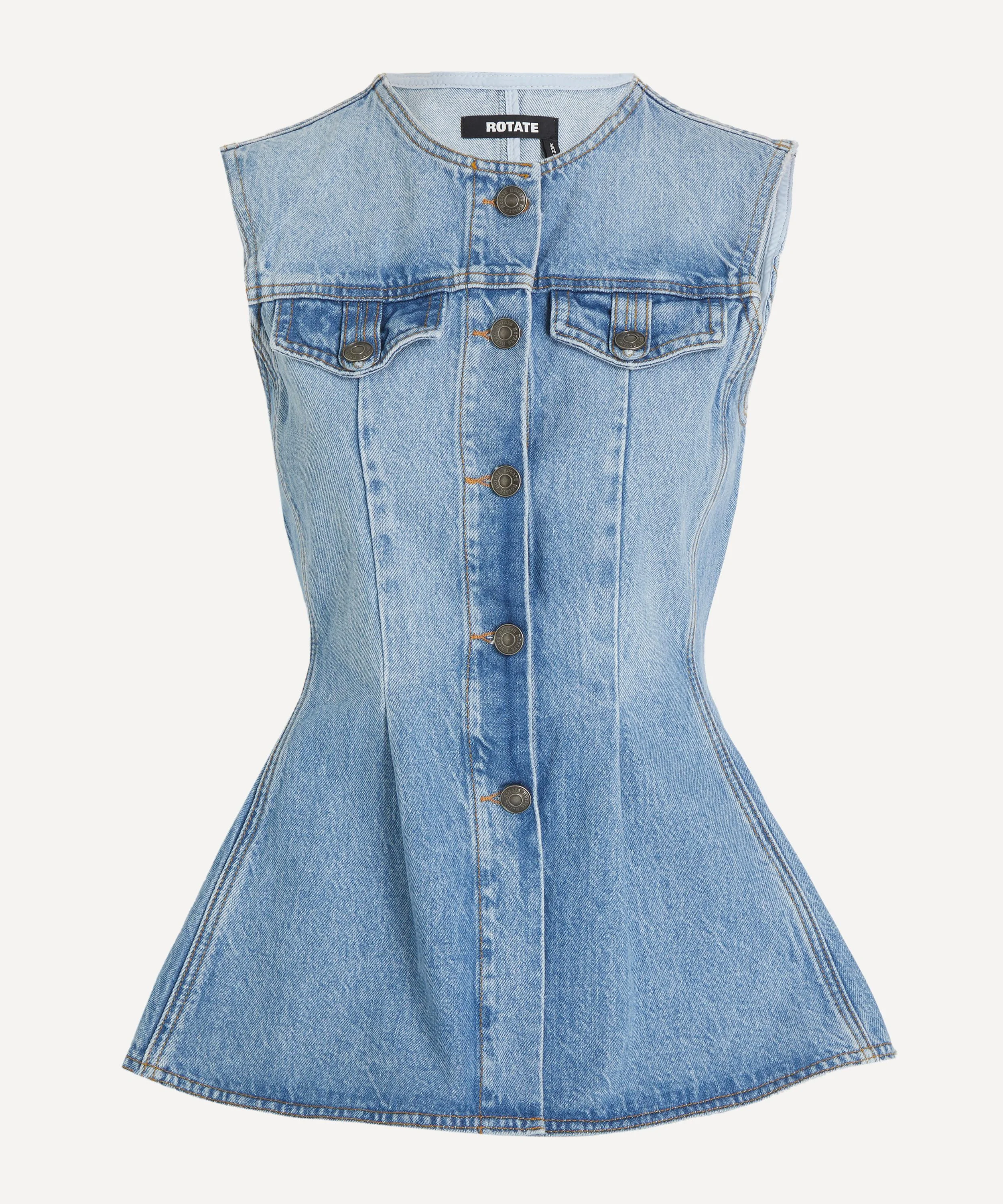 DETAILS Denim top Fit-and-flare silhouette Sleeveless Round neckline Button closure Two buttoned chest flap pockets Shank buttons Flared hem SIZE & FIT Model is 176cm/5'9.5"; Chest: 78cm; Waist: 62cm; Hip: 91cm and wears a size 8 COMPOSITION & CARE 100% Cotton Dry clean