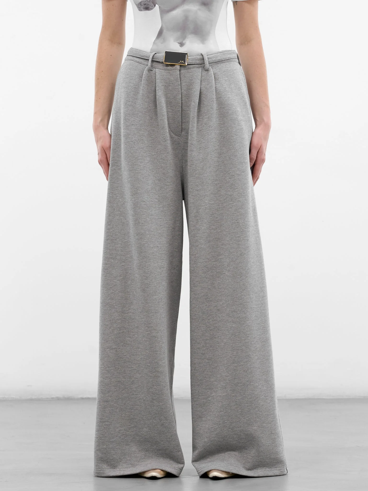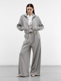 Pants in gray constructed from cotton fleece with an integrated belt and pleated wide-leg silhouette. Featuring: • Baggy fit • Cotton fleece construction • Belt loops with back logo patch • Integrated buckle belt with logo • Front button and zip fly closure • Pleated front • Side welt pockets • Back welt pockets • Wide leg • Made in Italy • 100% Cotton • Standard sizing Model is 5'8" wearing size S. Bust: 32” Waist: 25” Hips: 35”