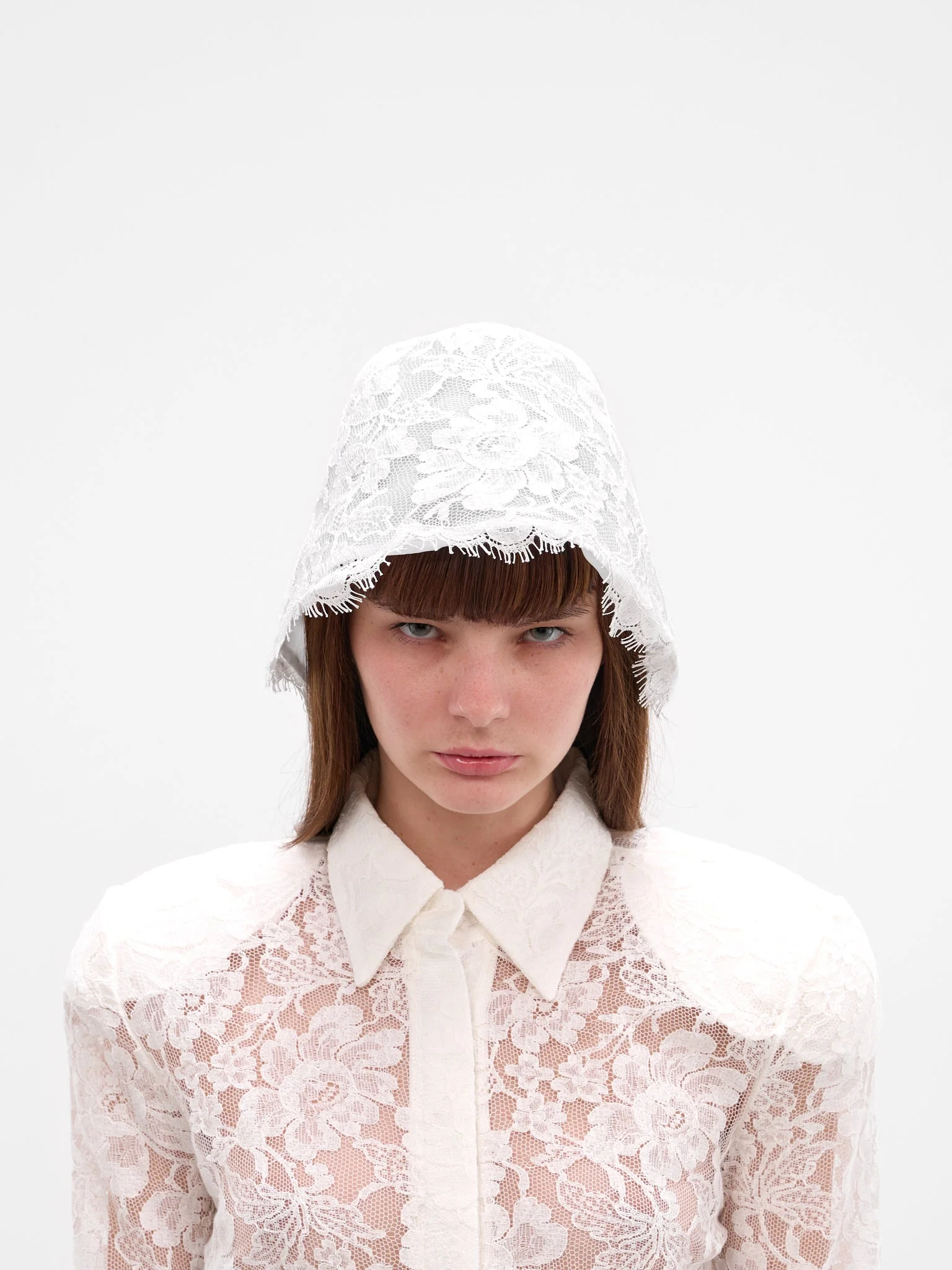 White sheer lace cloche hat with floral lace pattern and scalloped brim. Featuring: • Cloche hat design • Sheer fabric • Floral lace pattern • Scalloped brim • Lined • Made in Italy • Main: 68% Cotton 25% Viscose 7% Polyamide | Lining: 100% Polyester • One size