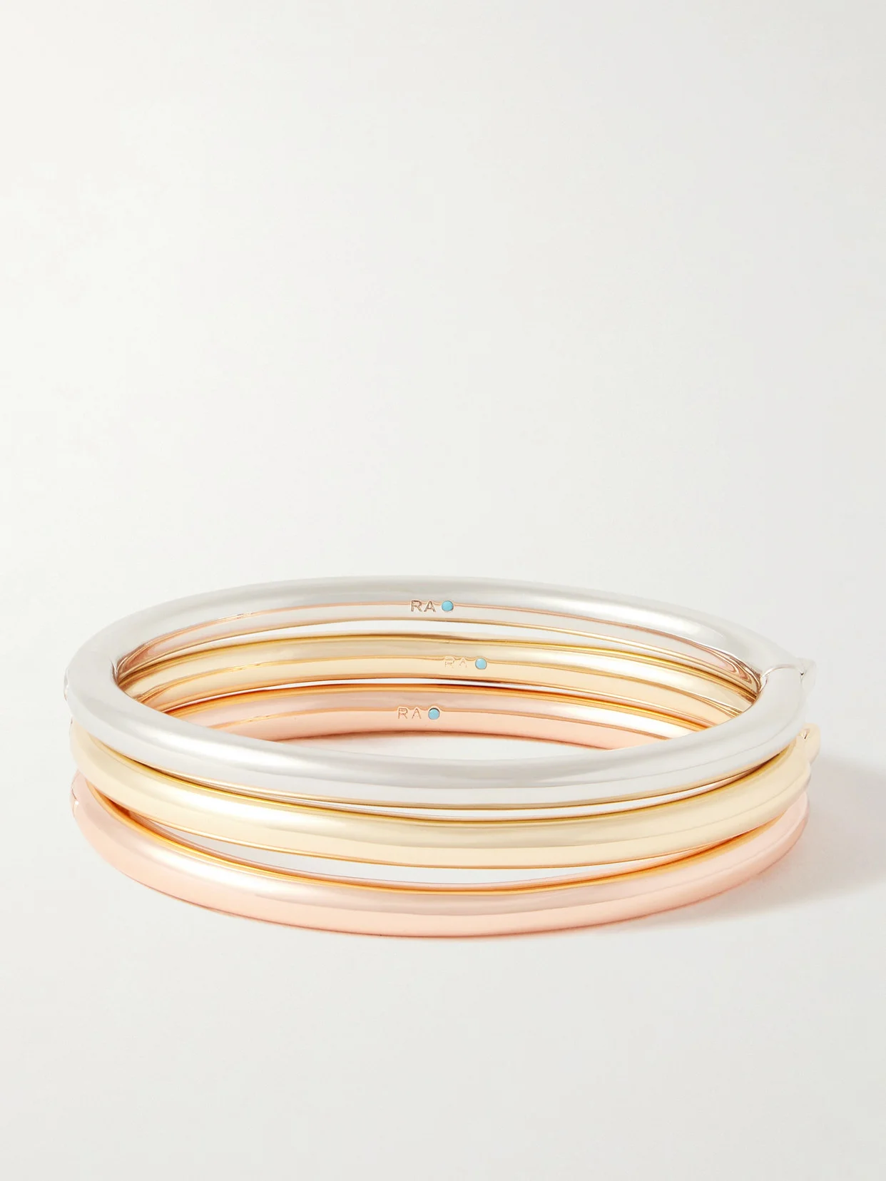 The Tubular Hinged Set Of Three Gold, Rose Gold And Silver-tone Bracelets