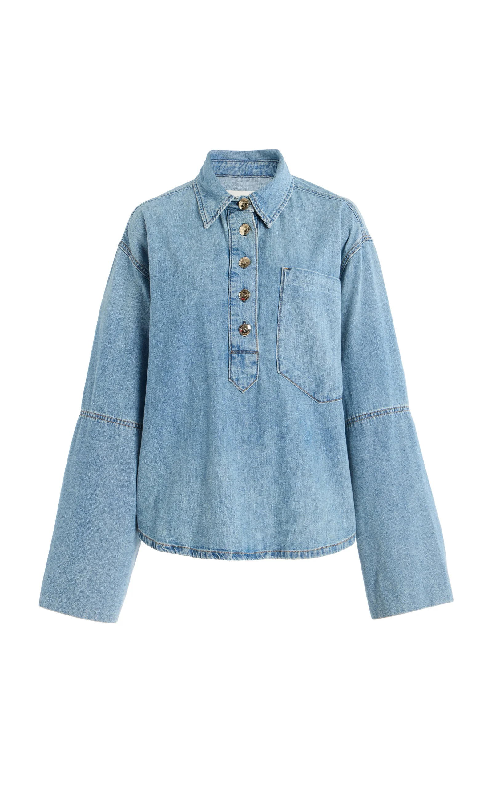 Scottish Gaelic for "red", RUADH (pronounced “roo-ah”) is associated with concepts of strength and resilience — much like denim. The NYC-based brand crafts its collections in small batches from ethically sourced materials in organic silhouettes inspired by natural formations of the earth. Crafted from organic cotton The Finlay shirt is a classic oversized pop-over shirt. The fit features double layer sleeves for a more tailored structured look. Featuring signature semi-precious branded gold hardware this shirt was made in LA at Saitex a 4.0 smart factory in Los Angeles. PRODUCT DETAILS - Resort '25 - Button fastening - Composition: 100% organic cotton - Designer color: Caledonian - Machine wash - Made in the USA SIZE & FIT - Designed for an oversized fit