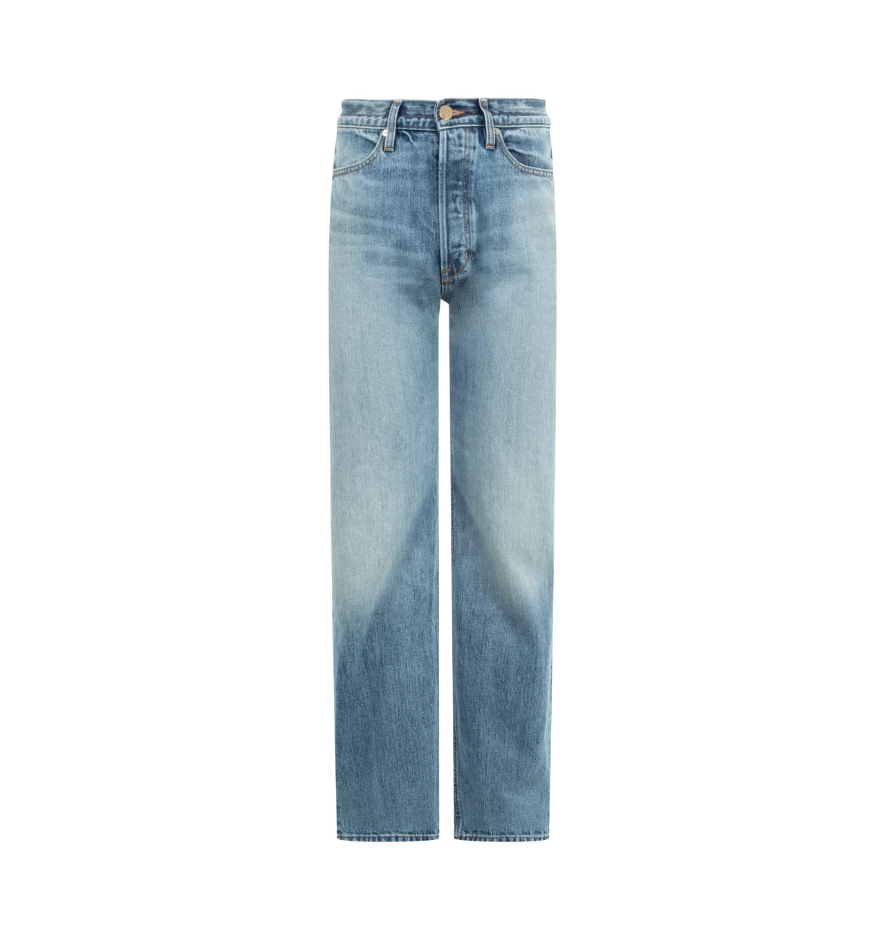 RUADH The Agnes Jean featuring a mid rise, slim straight profile, five-pocket construction, signature triple belt loops at the back waist, semi-precious gold hardware, shank and fly closure and straight leg. 75% regenerative cotton, 25% recycled PIW. Made in the USA. DESIGNER STYLE ID: SP26D020SF5HAR COLOR: HARRIS WASH
