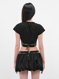 This black RUIbuilt top offers a cropped length with a slim silhouette. A dramatic V-neckline with crossed straps, a front cut-out, and finished with a signature two-tone intarsia knit hem band. Featuring: • Slim fit and cropped length • Short sleeves and V-neckline • Crossed straps and gathering at collar • Front cut-out detail • Two-tone intarsia knit hem band • Oblong button fastening • Made in China • Main: 64% Cotton 32% Modal 4% Silk | Secondary: 83% Polyamide 17% Spandex • Numerica sizing Model is 5'7" wearing size 1. Bust: 30" Waist: 24" Hips: 35"