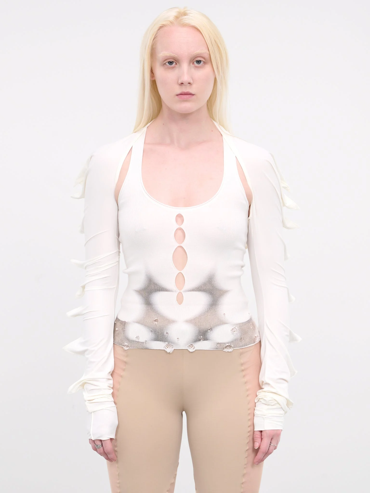 RUI cardigan in vapor, bolero cardigan design, paneled stretch nylon construction, semi-sheer, contrast paneling, spikes throughout, rounded neck, back metal logo plaque, open front, long sleeves, back draping, cropped length, slim fit. 77% Polyamide 23% Spandex Numeric Sizing Model is 5'8" wearing size 1. Bust: 30" Waist: 24" Hips: 33.5"
