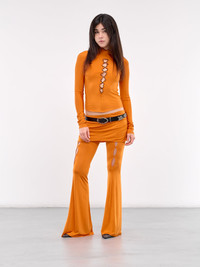 RUI top in orange, paneled construction, turtleneck, ruffling, long sleeves, front cut-outs, straight hem, form fit. Numeric Sizing Model is 5'8" wearing size 1. Bust: 32" Waist: 24" Hips: 33"