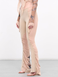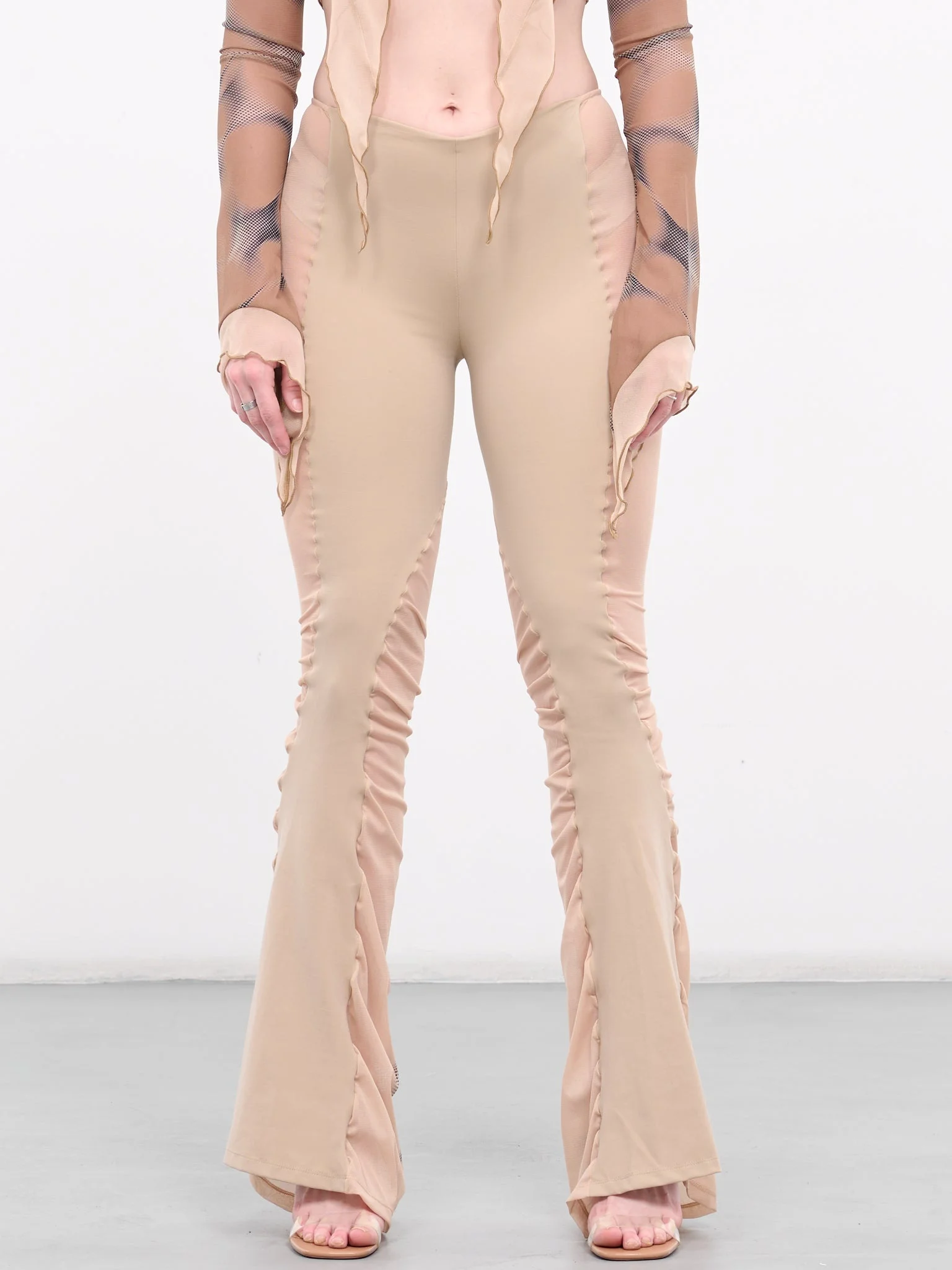 RUI leggings in oatmeal & nude, paneled mesh construction, semi-sheer, abstract print, ruching throughout, contrast paneling, fitted waist, flared leg, slim fit. Standard Sizing Model is 5'8" wearing size S. Bust: 30" Waist: 24" Hips: 33.5"