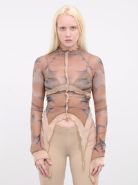 RUI top in coffee, paneled mesh construction, sheer, abstract pattern, ruffled trim throughout, round neck, long sleeves, angled cuffs, asymmetric hem, slim fit. Standard Sizing Model is 5'8" wearing size S. Bust: 30" Waist: 24" Hips: 33.5"