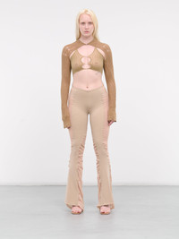 RUI tank in coffee, nylon knit construction, sheer, crystal pearls, beaded halterneck, sleeveless, open back, front & back keyhole cut-outs, straight hem, cropped length, slim fit. 92% Nylon 8% Spandex Numeric Sizing Model is 5'8" wearing size 1. Bust: 30" Waist: 24" Hips: 33.5"