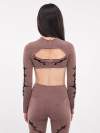 RUI sleeves in rose, bolero design, paneled knit construction, thorn intarsia knit pattern, round neck, front button closure, long sleeves, raw hems, high crop, form fit. Numeric Sizing Model is 5'8" wearing size 1. Bust: 32" Waist: 24" Hips: 33"