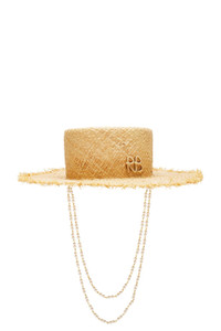 - 100% straw - Made in Ukraine - Spot clean - Straw hat with raw brim and tonal monogram at front - Detachable layered faux pearl chain - Brim measures approx 3.5" in length Size S measures approx 20.41" in circumference - Revolve Style No. RUSR-WA158 - Manufacturer Style No. CNT036-STR-PRL-2CHA-SRB