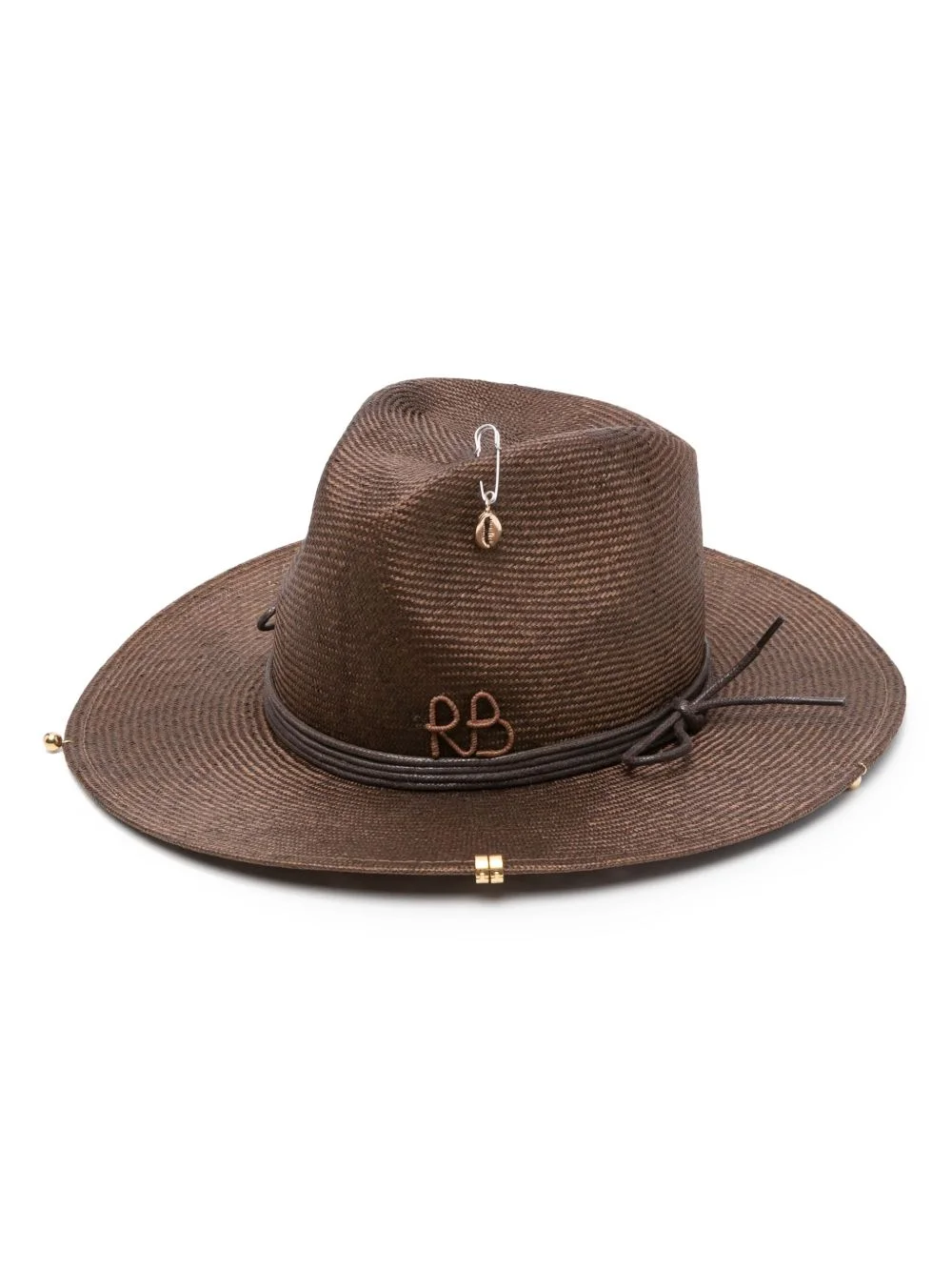chain-strap straw fedora hat Highlights - Cedar brown - Cotton - Straw - Concave crown - Wide brim - Gold-tone hardware - Chain-link detailing - Shell pendant Imported Composition Lining: Cotton 100% Outer: Straw 100% SIZE & FIT Measurement BRIM 3.14 in(8 cm) CIRCUMFERENCE 21.45 in(54.5 cm)